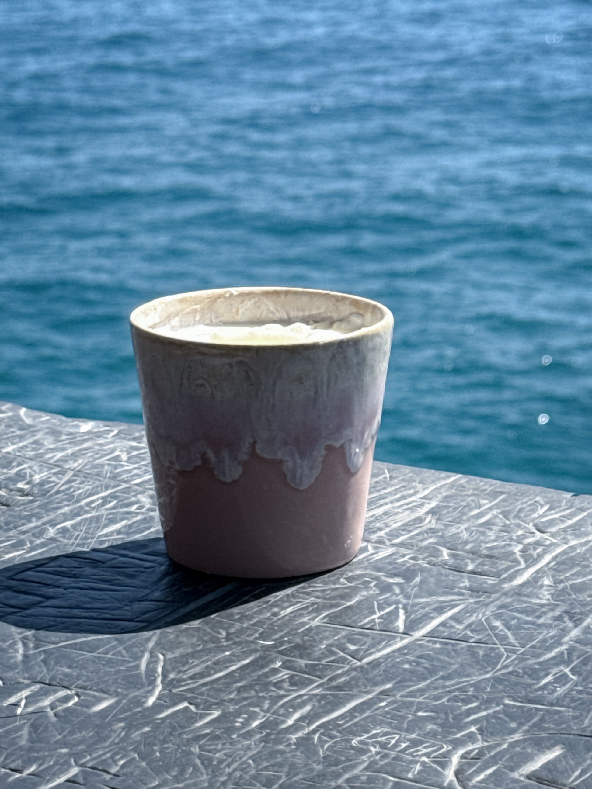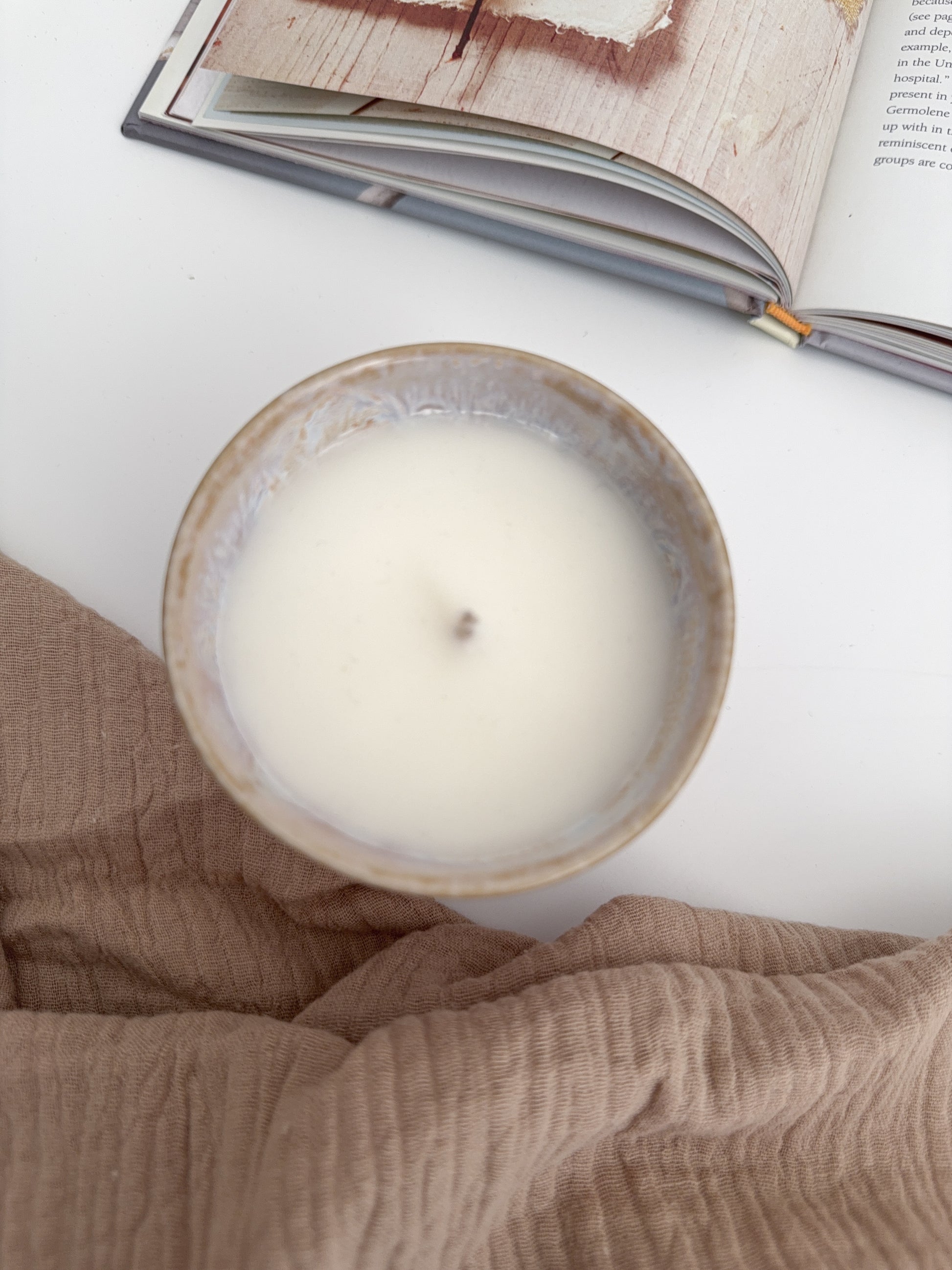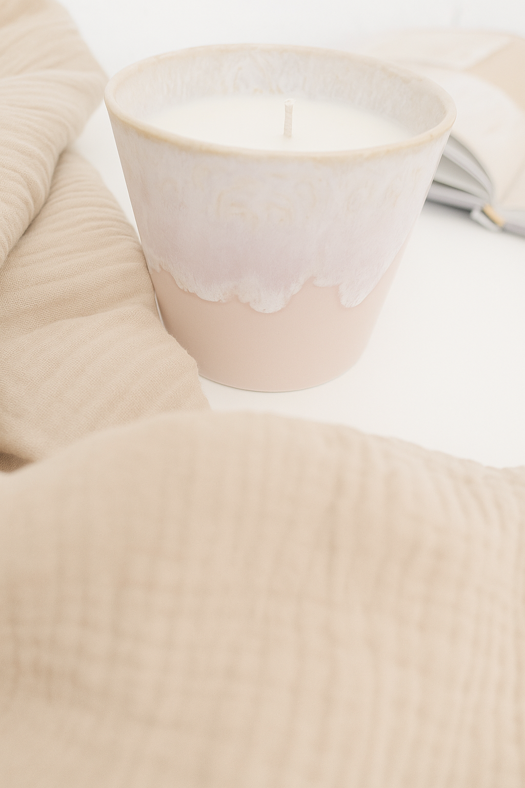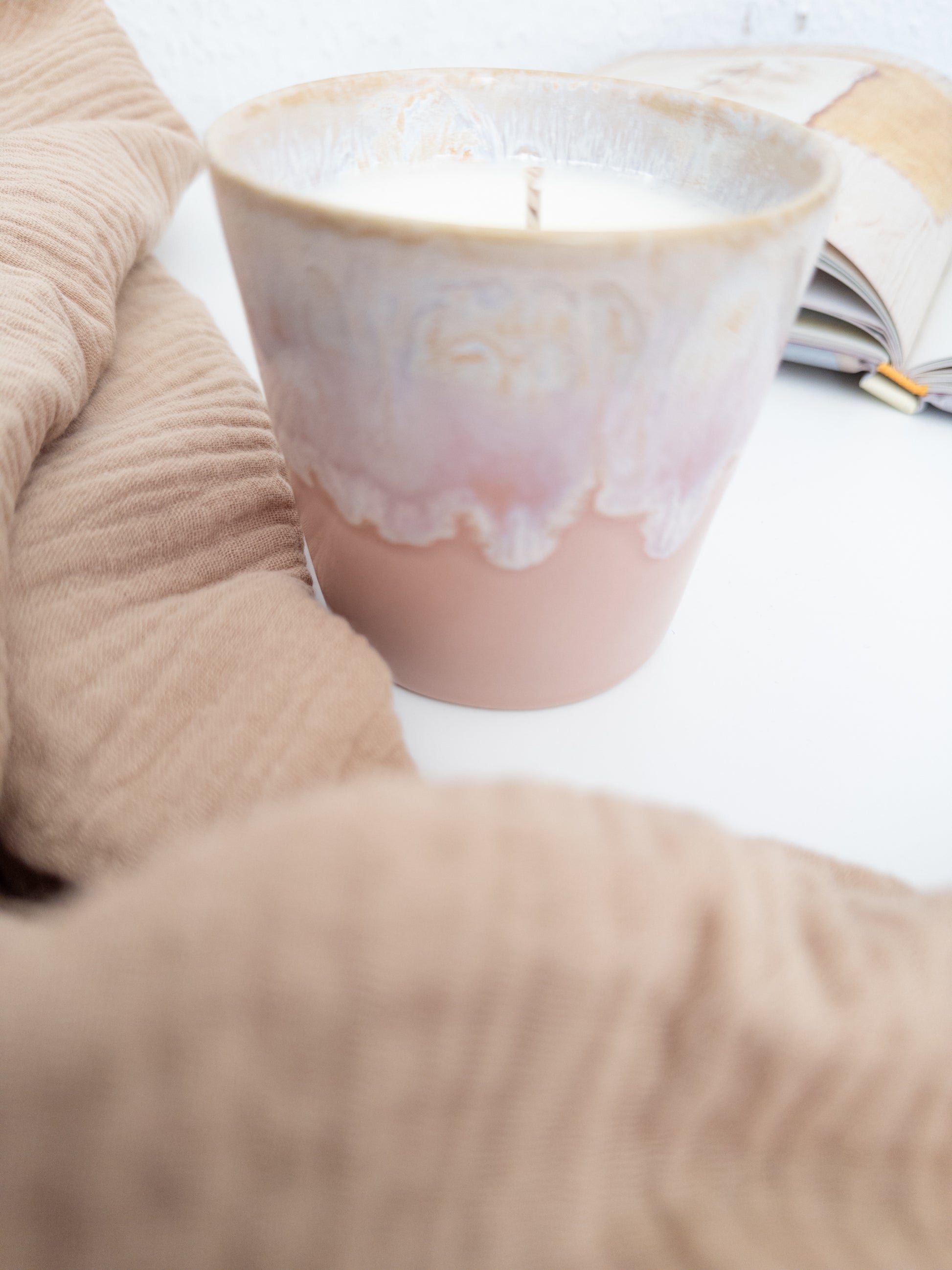 Handgegossen in eine feine Rosé-Keramiktasse, die du später für Tee/Kaffee oder kleine Rituale weiterverwenden kannst, ist sie ein Begleiter für stille Stunden.